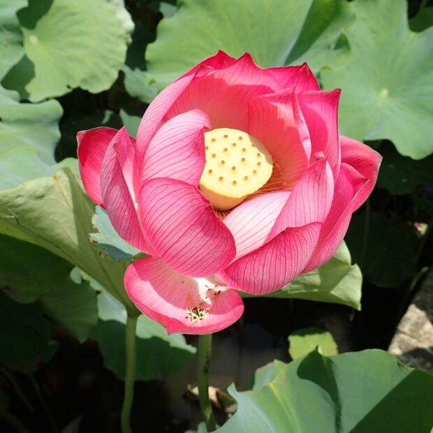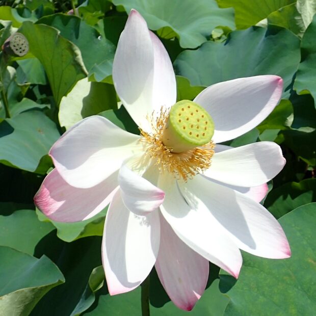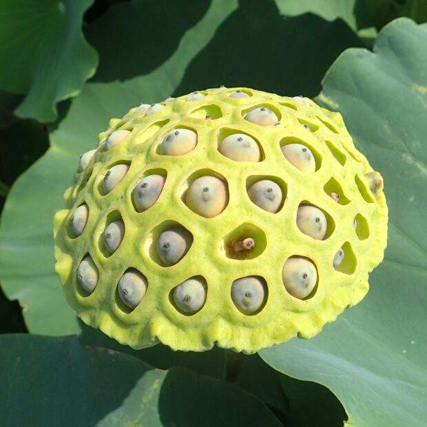 ユニークなレンコンの輪切りをスタンプがわりに使うのも楽しいです。 種子が落ちたあとの蜂の巣状の実は、 乾燥したものを花材や飾物づくりに活用できます。