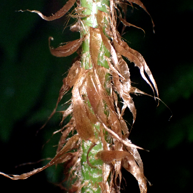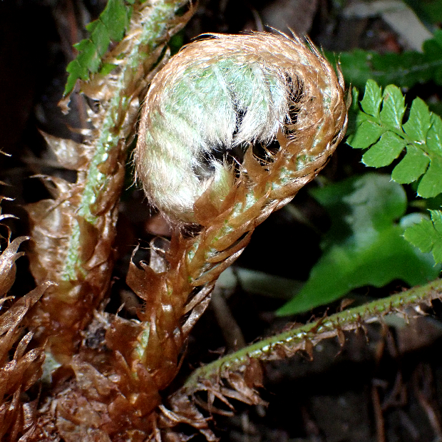 低地でごく普通に見られるタテに長い形のシダ。 茶色い鱗片がたくさんつく新芽がイノシシの手に例えられました。 イノデ類にはたくさんの種類がありますが、 本種は鱗片が明るい茶色で幅広く、 鱗片のフチに小さな突起があることなどが特徴です。