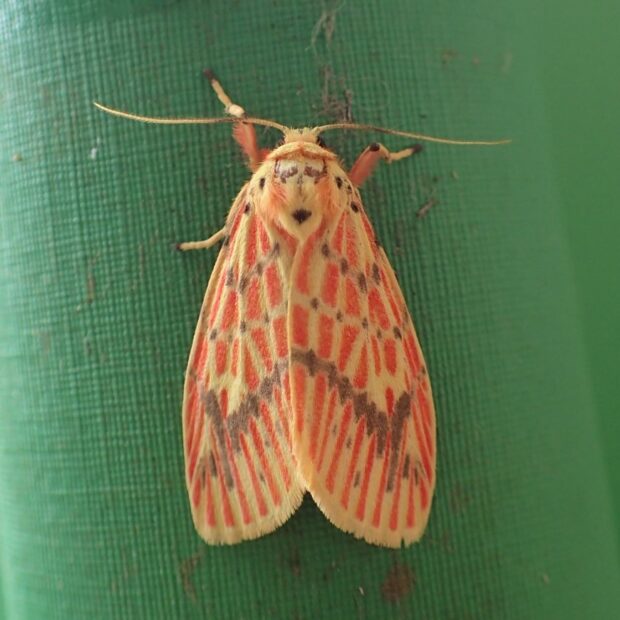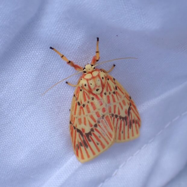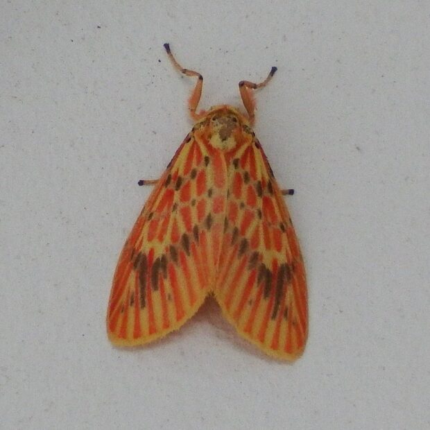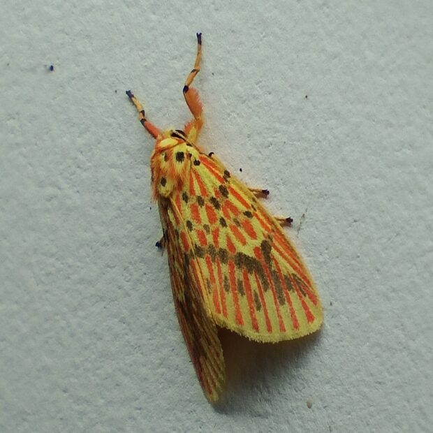 美しいコケガの仲間。 黄色っぽいはねに、 黒い点と赤い線が特徴ですが、 赤い線がないものなど、 模様に変異が多く、 微妙な違いが見られます。 平地から山地まで普通に見られ、 明かりによくやってきます。