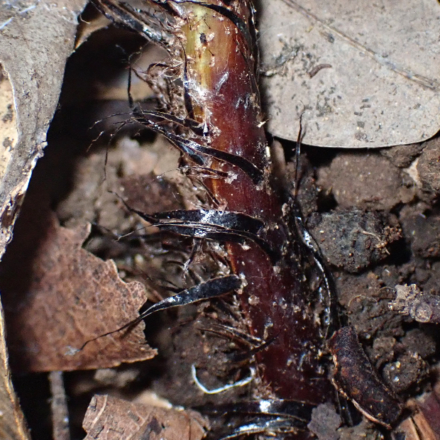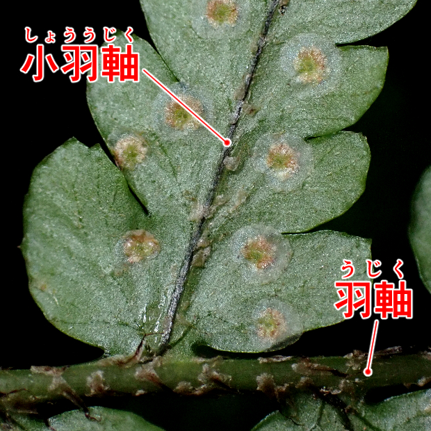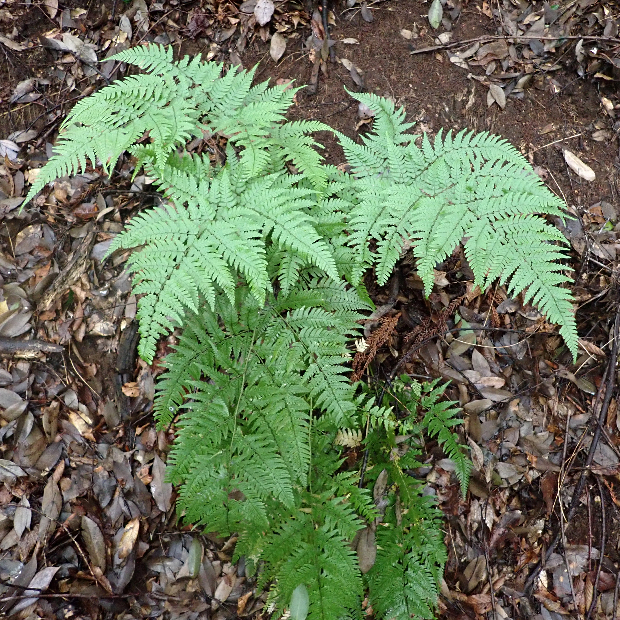 西日本に多いシダ。 全体的な見た目はオオイタチシダに似ています。 本種の葉は黄色っぽくて切れ込みは互いに重なり合う感じにつきます。 葉柄基部の鱗片はテカリが強い黒色で、 フチが薄い色をしていることも特徴です。