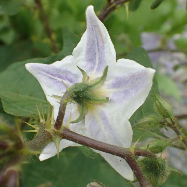 鋭いとげがありますので、 触るときは要注意です。 黄橙色に熟すミニトマトのような実は有毒ですので、 けっして食べないでください。