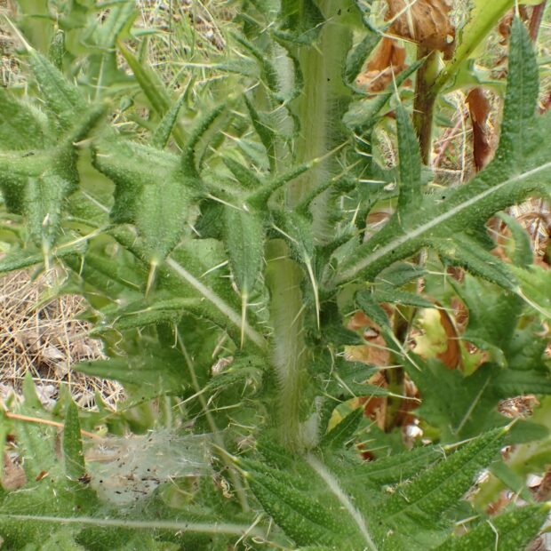 鋭いとげは皮膚に刺さると折れてとれなくなったりして危険です。 触らないようにしましょう。 駆除作業には皮手袋を着用し、 じゅうぶんに注意する必要があります。 刈ったものは焼却処分しましょう。 とげが危ないので、 新聞紙数枚を広げたものにくるんでゴミ袋に入れるなど配慮しましょう。 刈ったまま放置すると危険なばかりか、 熟して種ができ散布されてしまいます。 根が残ると再生するので、 根も掘り取って処分するのがベストです。 春先のロゼット状の小さいうちに見つけて駆除するのが効果的です。 ロゼットも、 葉の鋭く長いとげですぐにわかります。
