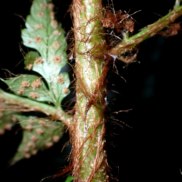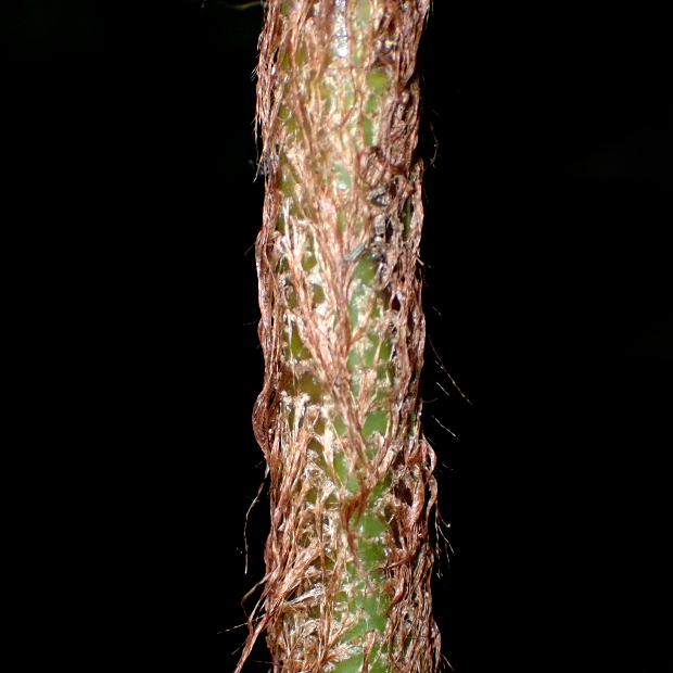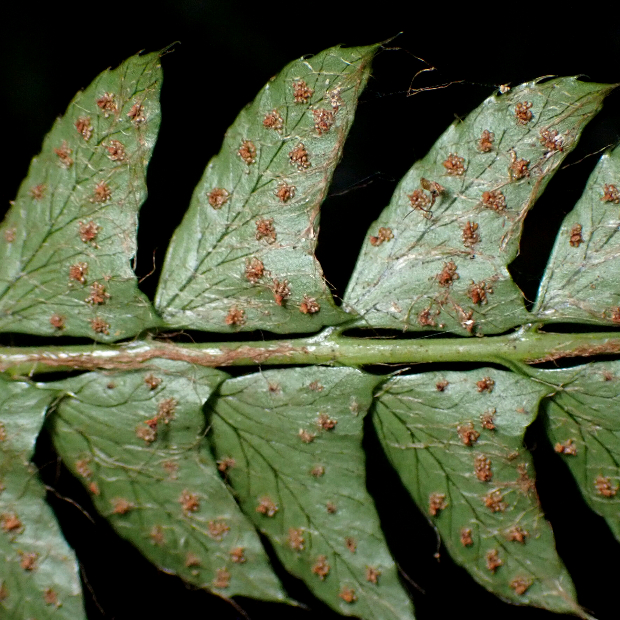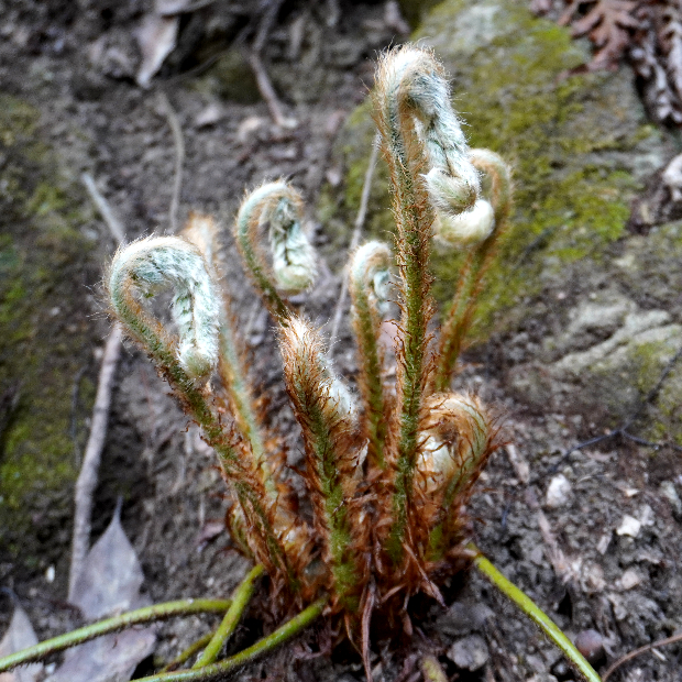 関東を代表するイノデの仲間のシダ。 大きな葉は光沢が強くて濃い緑色でとても迫力があります。 葉柄につく鱗片は細めでフチに突起がなく、 よくねじれることも大きな特徴です。 名前は東京都の飛鳥山に由来します。 日本固有種です。