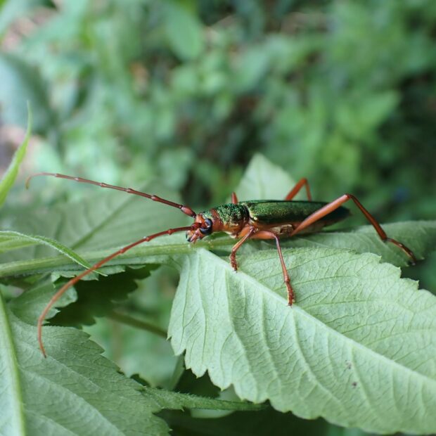 金属光沢のある緑色で、 触角とあしが赤茶色の美しいカミキリムシ。 クヌギの大木が多い里山などで見られます。 夜になるとクヌギの樹液に集まり、 明かりにもやって来ます。 アオカミキリの仲間は柑橘系の匂いがします。