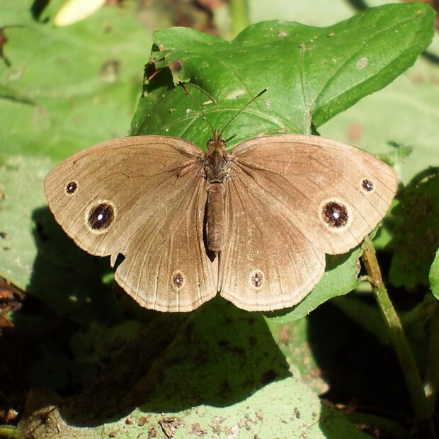 ヒメジャノメは、 はねの色は明るく、 明るい環境を好みます。 白い帯は黄色みをおびます。