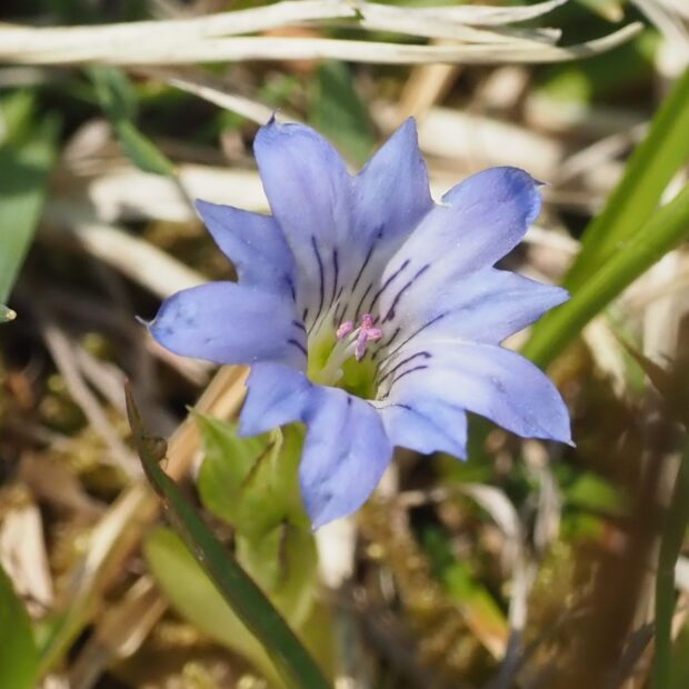 よく似たフデリンドウとは、 根生葉のあるなしが分類のポイントですが、 霜にあたって葉が枯れてしまうことも多く、 わかりにくいです。 湿った場所に生育することや、 複数の花茎が株の元から立ち上がること、 花茎につく葉の形などが見分けのポイントです。