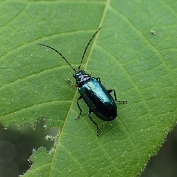 藍色の光沢があるヒゲナガハムシの仲間。 春から初夏に見られ、 胸にはっきりした横ひとすじの溝があるのが特徴です。 クワ、 ヒメコウゾなどの他、 いろいろな植物の葉を食べます。 メスは土の中に卵を産み、 幼虫は根を食べると言われています。