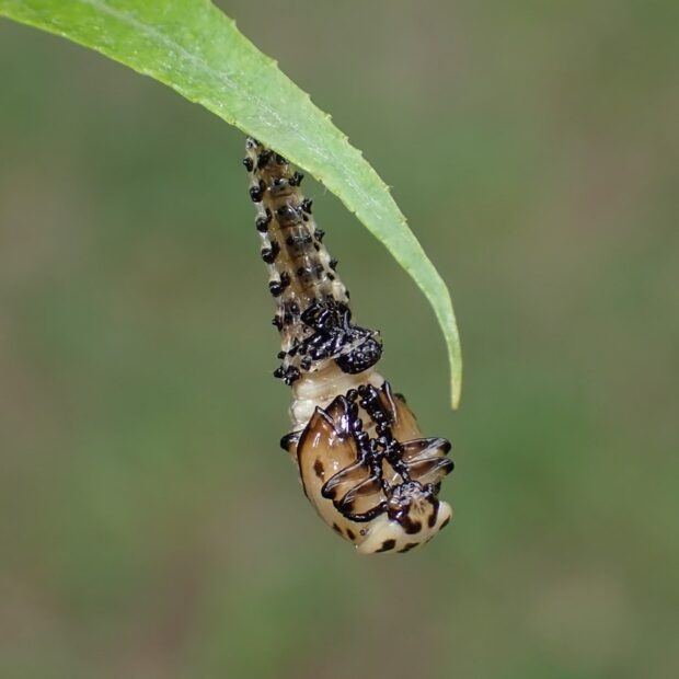 • 蛹。 集団でヤナギの葉にぶら下がる。