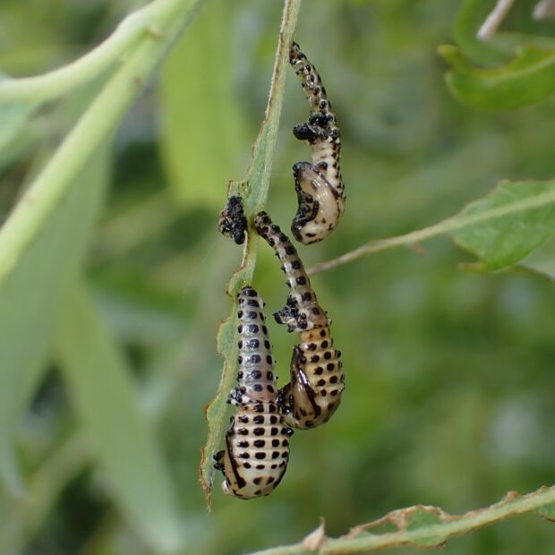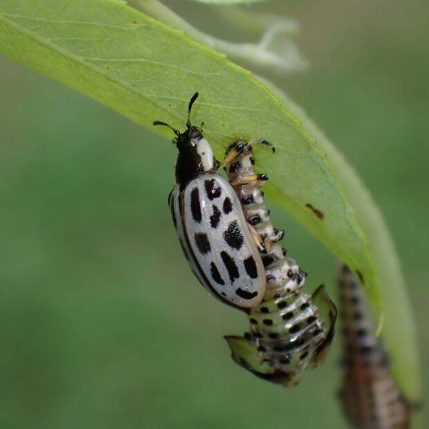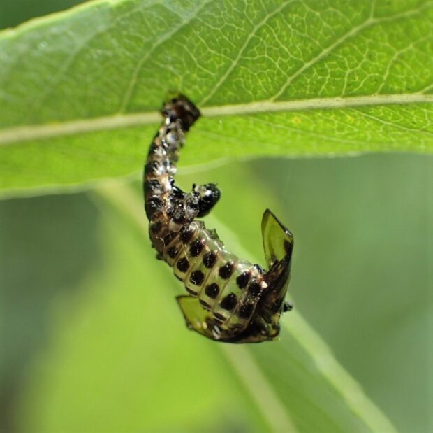 ヤナギハムシの幼虫を食べにカメノコテントウがやって来ることがあります。
