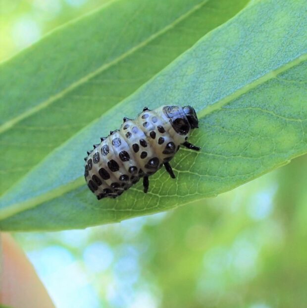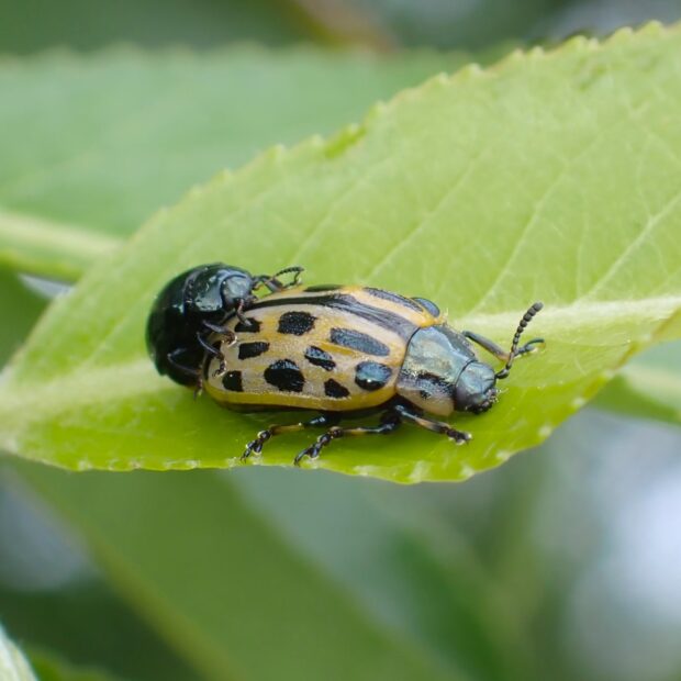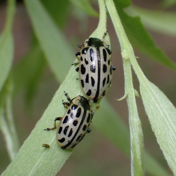 ヤナギを食べるハムシ。 上翅(じょうし)は黄褐色~オレンジ色で、 左右それぞれ10個の黒い紋をもちますが、 黒い紋は変異があり、 紋がないものもいます。 新成虫は初夏にあらわれます。
