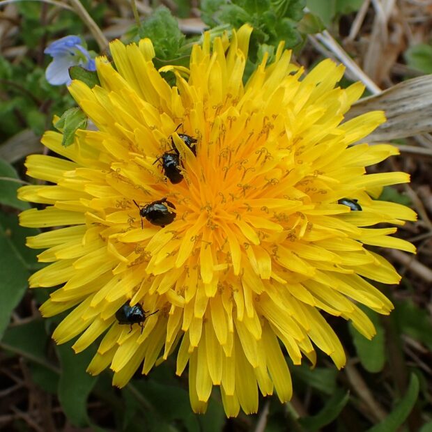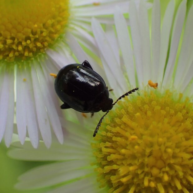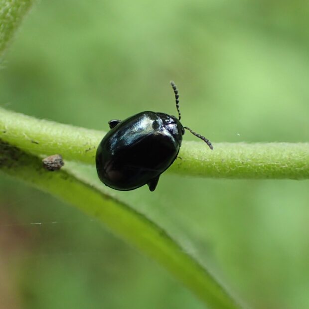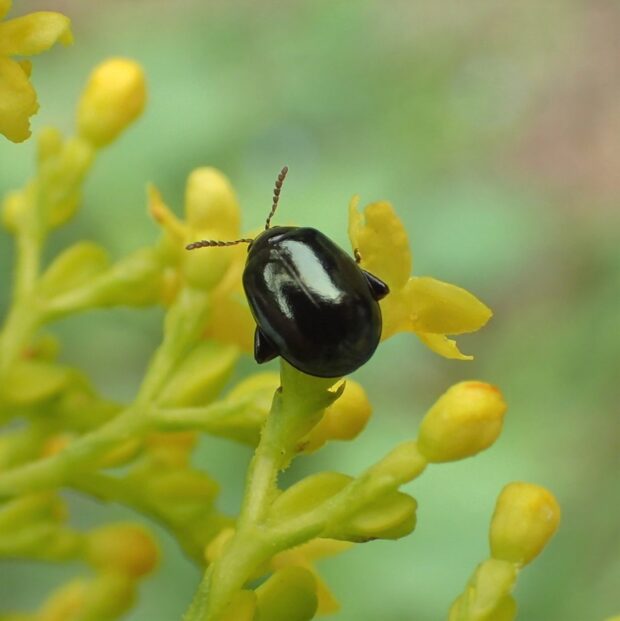藍色~緑銅色の光沢がある、 小さな丸いハムシ。 いろいろな花に集まり、 花粉や蜜を食べます。 蕾や花びらを食べることもあります。 後あしの腿節が太くなっており、 飛びはねることができます。 (MT)