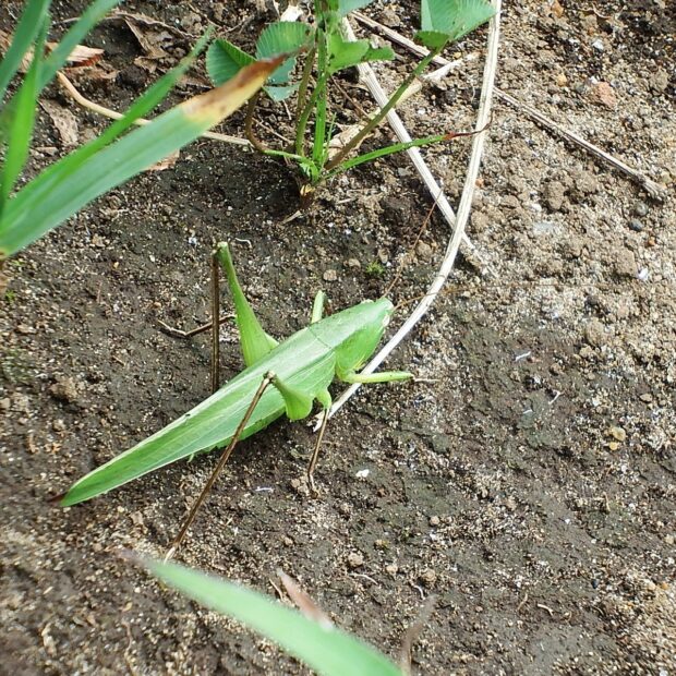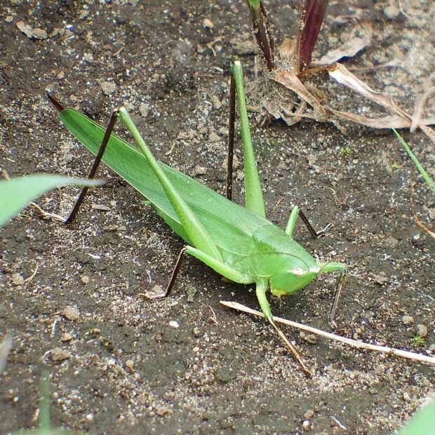 後あしが長いキリギリスの仲間で、 緑色型と褐色型がいます。 メスは長めの産卵管をもち、 イネ科植物の根際などに産卵します。 卵で越冬し、 初夏にふ化します。 鳴き声は「ジーーー」。