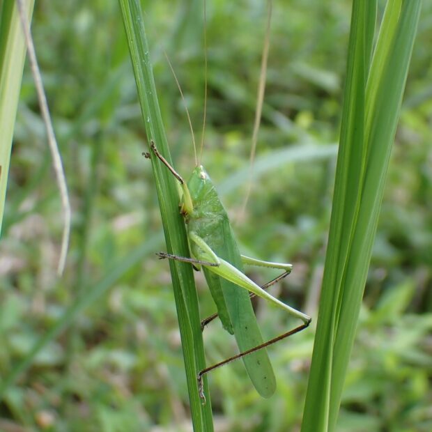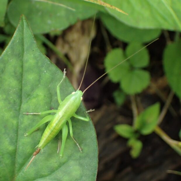 クビキリギスは頭の先がとがり、 大アゴがオレンジ色です。