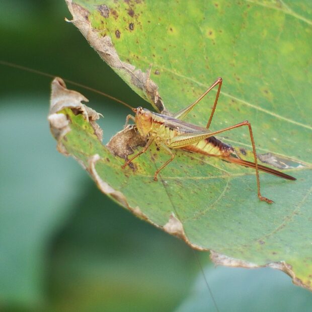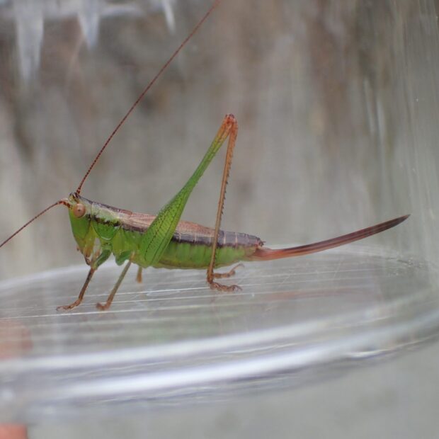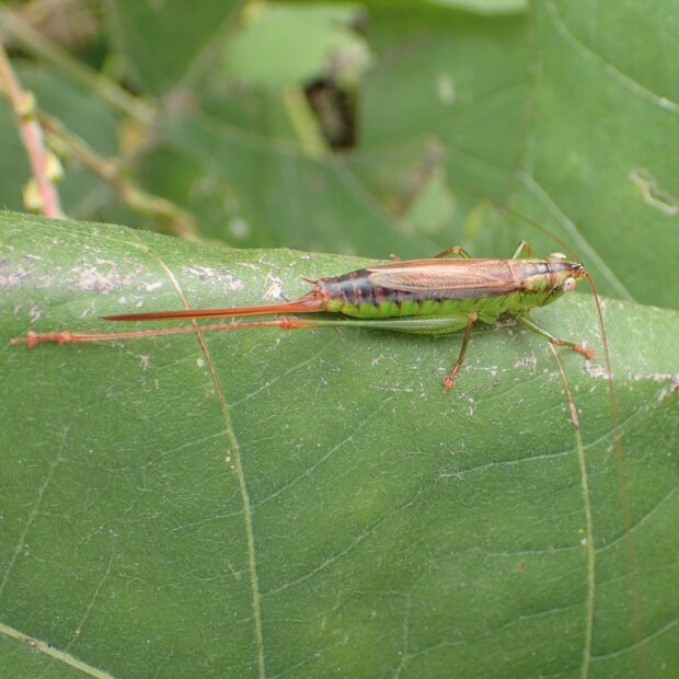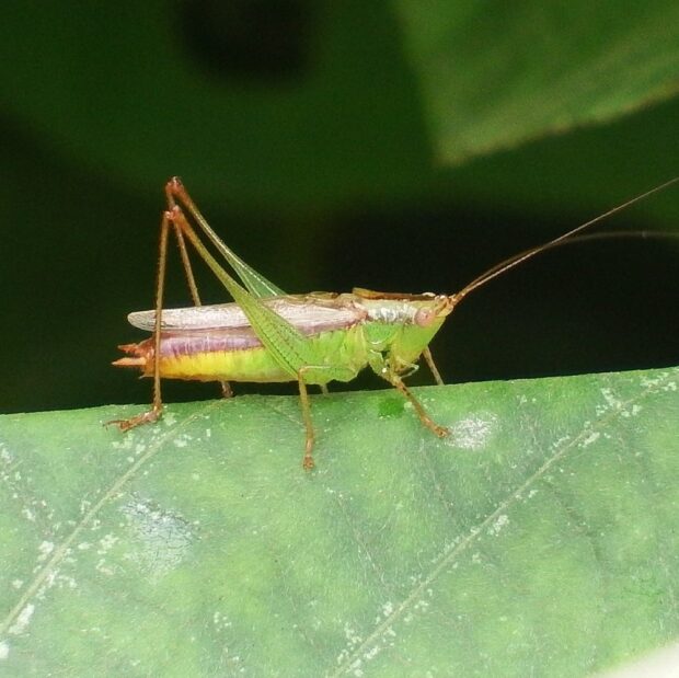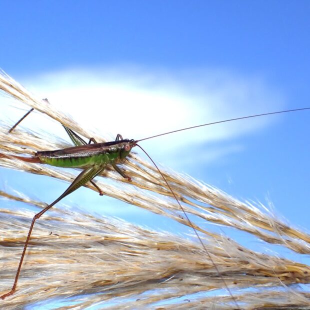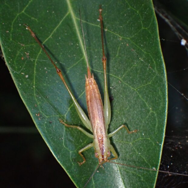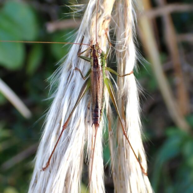 はねの短いキリギリスの仲間ですが、 稀にはねの長いタイプもいます。 触角がとても長く、 体の3~4倍もあります。 ヨシ原、 田んぼの周り、 湿気の多い草はらなどで見られます。 鳴き声は「ジ、 ジジ、 ジジジジ」。