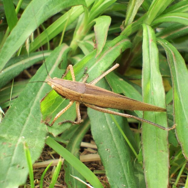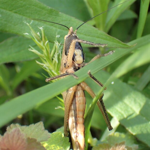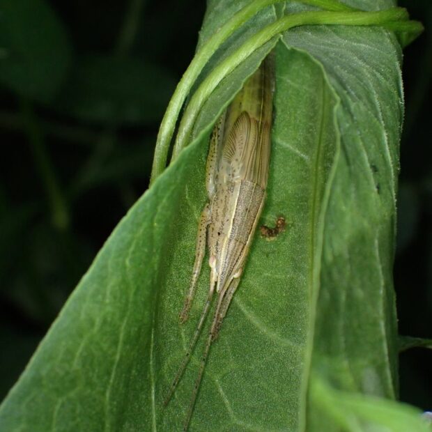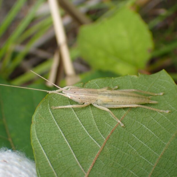 枯れ葉色で、 頭の先が尖っているキリギリスの仲間。 ススキ、 ヨシなど背の高いイネ科植物が多い草はらで見られます。 秋に成虫になり、 そのまま冬を越し、 翌年の春から初夏の夜に、 「ジャー」としわがれた大きな声で鳴きます。 メスは、 イネ科植物の根元近くの葉鞘に産卵します。