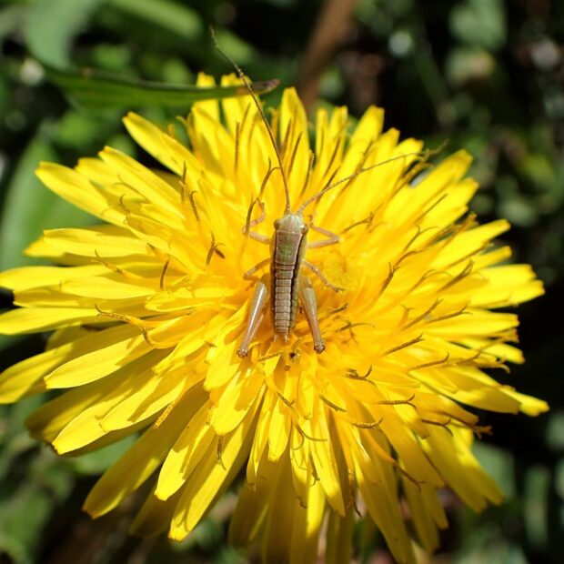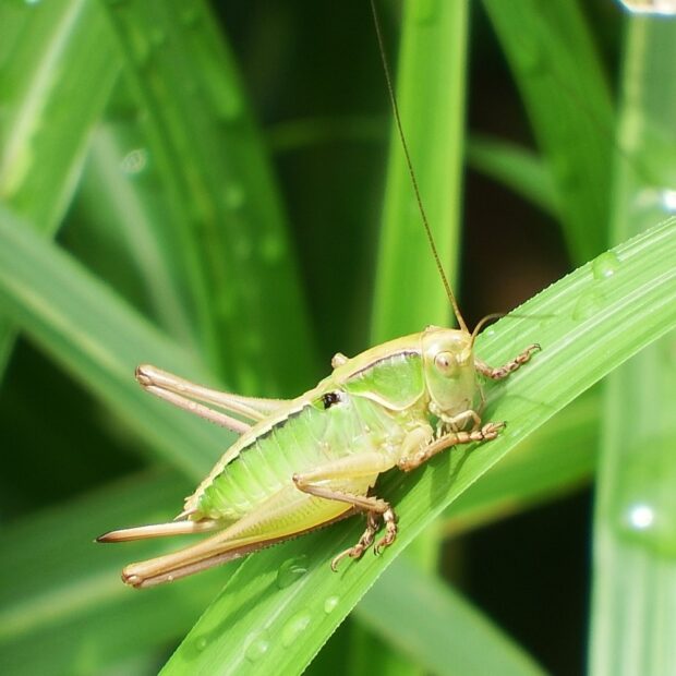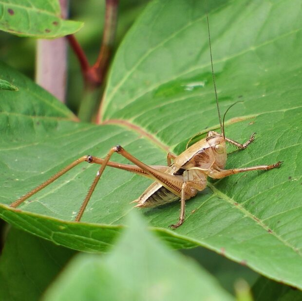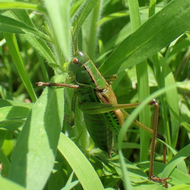 草はらで、 昼間に「ギーース、 チョン」と声は聞こえても、 姿はなかなか見られません。 キリギリスは、 東日本のヒガシキリギリス(はねは短めで前ばねに黒点が多い)と西日本のニシキリギリス(はねは長めで前ばねの黒点がないか、 あっても一列程度)に分けらます。 (MT)