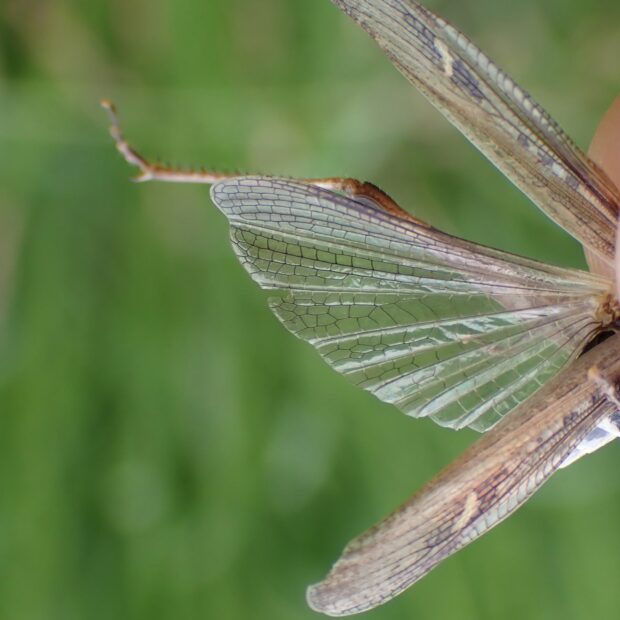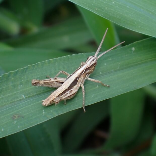 1年に2回発生し、 本州において、 卵で越冬するバッタの中では、 もっとも早く成虫があらわれます。 オスは前ばねに後あしをこすりつけ、 「シュリリリリリ・・・」と小さな音を出します。 (MT)