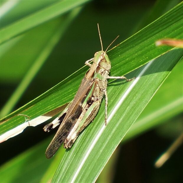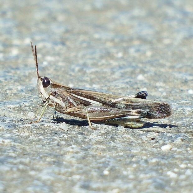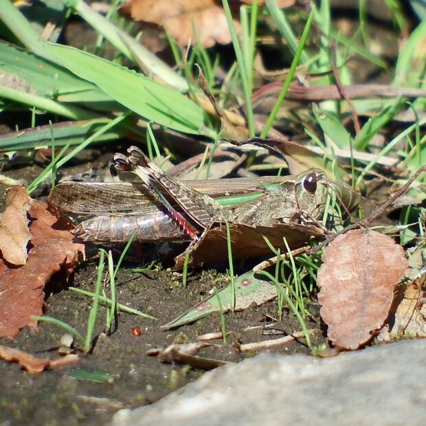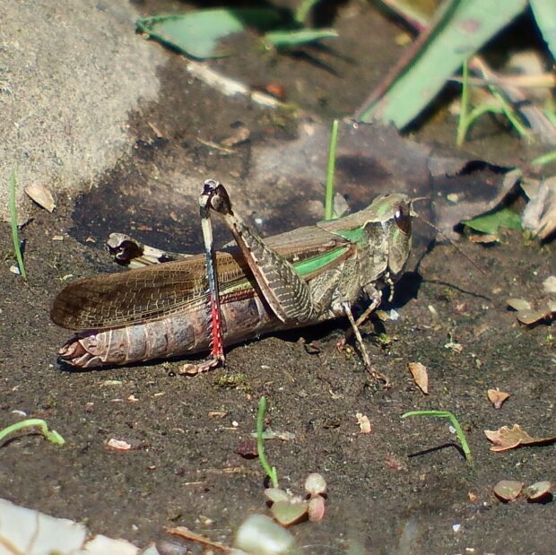 日当たりのいい半裸地を好む南方系のバッタ。 後あしに赤色、 黒色、 青色、 白色などのまだら模様があるのが特徴で、 名前の由来になっています。 体の色は褐色地、 緑色地、 まれに紅色がいます。 (MT)