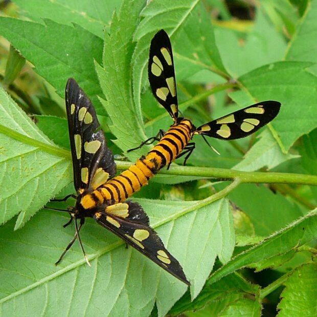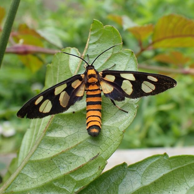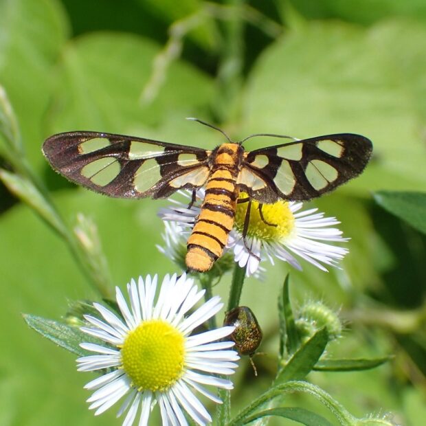 昼間に活動し、 花によくやって来るヒトリガの仲間。 ほっそりした黒いはねには、 鹿の子状(小鹿の背中にあるような模様)の半透明の白い紋があり、 黒いしま模様がある黄色の腹部が目立ちます。 (MT)