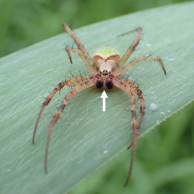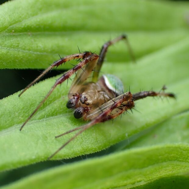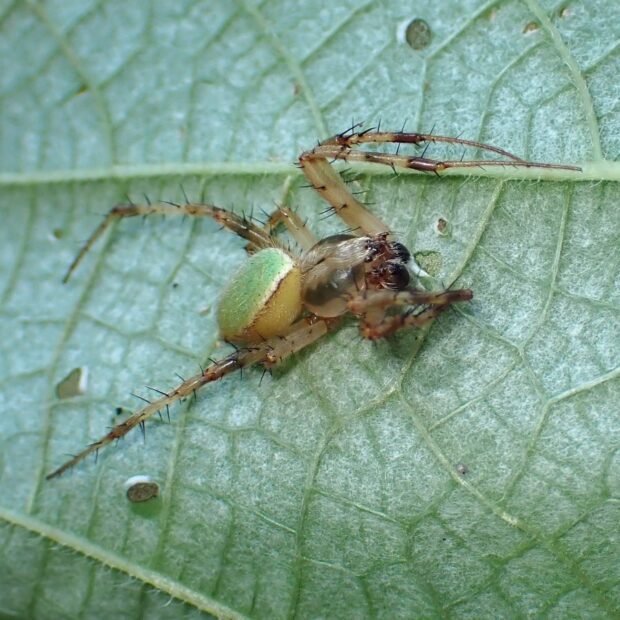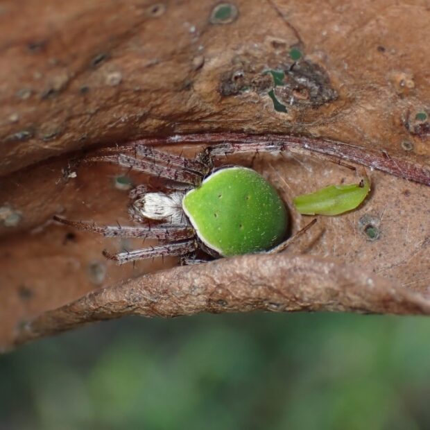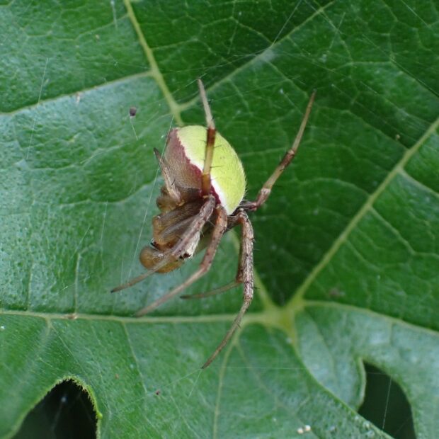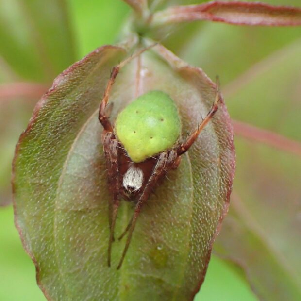コガネグモの仲間。 お腹が緑色で、 横にある黄色い線より下面が黒褐色または茶色のクモ。 サツマノミ(ハゼの実のこと)に似ていることが名前の由来です。 昼間は葉の上で休んでいることが多く、 夕方から円網を張ります。 市街地の公園や庭で、 普通に見られます。