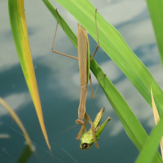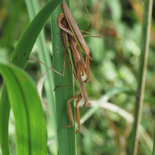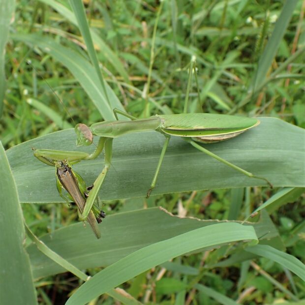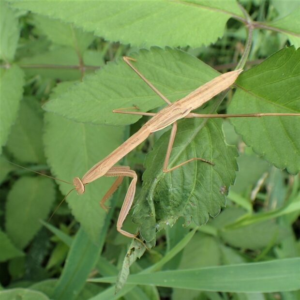 体の色は緑色または褐色で、 「カマキリ」と呼ばれることもあります。 田んぼの周辺や草はらの葉の上で待ち伏せをして、 生きている虫などを捕えます。 (MT)