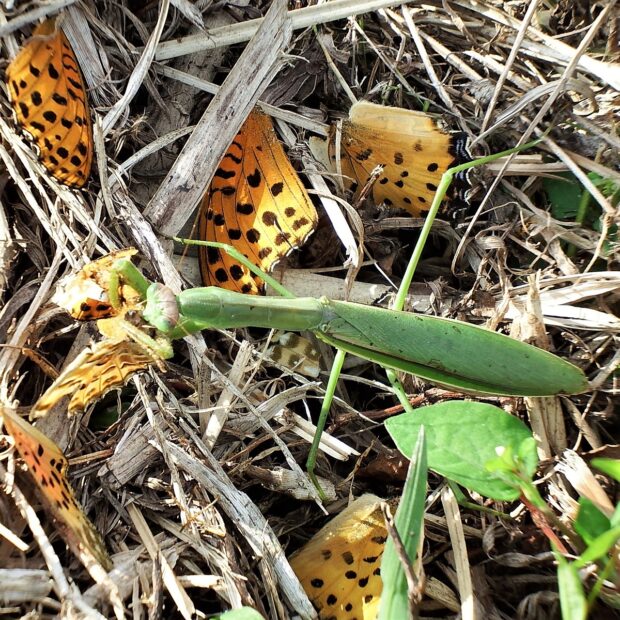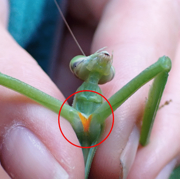 チョウセンカマキリは、 後ばねがほぼ透明で、 前あしのつけねの間がオレンジ色をしています。