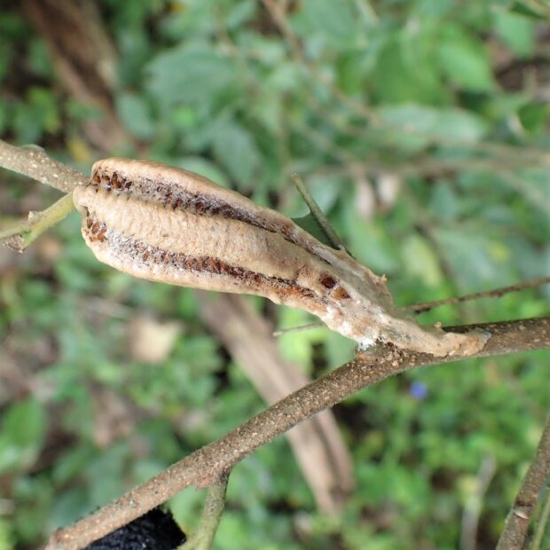 オオカマキリは、 後ばねが黒っぽく、 前あしのつけねの間がクリーム色をしています。