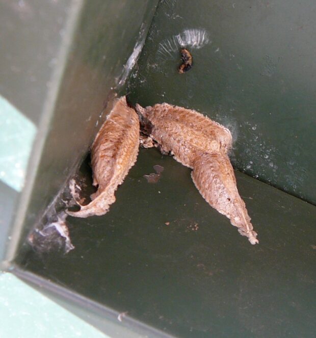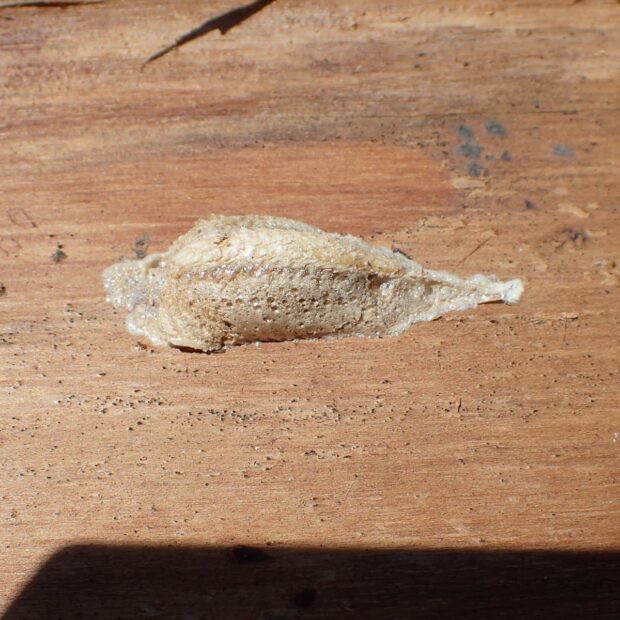 人工物の裏に産みつけられた卵鞘(らんしょう)3個。
