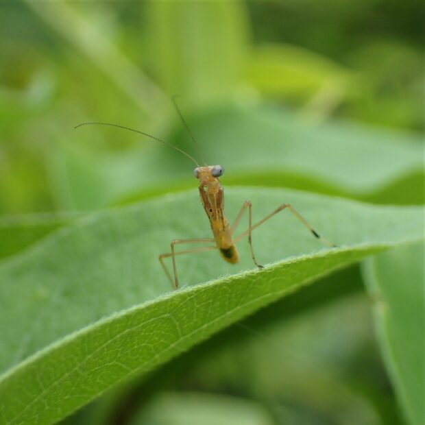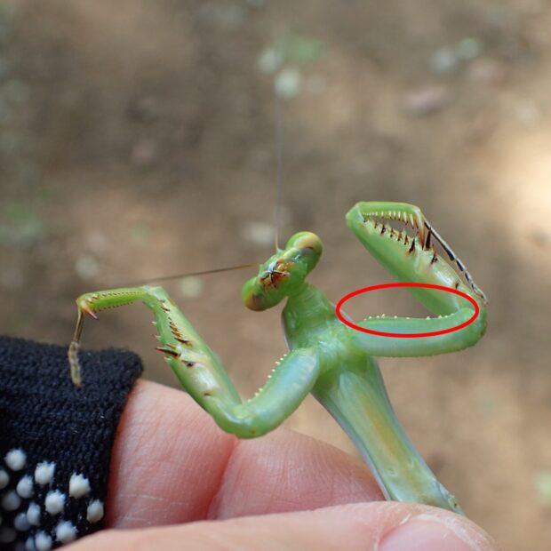 ムネアカハラビロカマキリは、 胸の裏側に赤みがあり、 前あしに黄色いイボが8~9個あるのが特徴です。