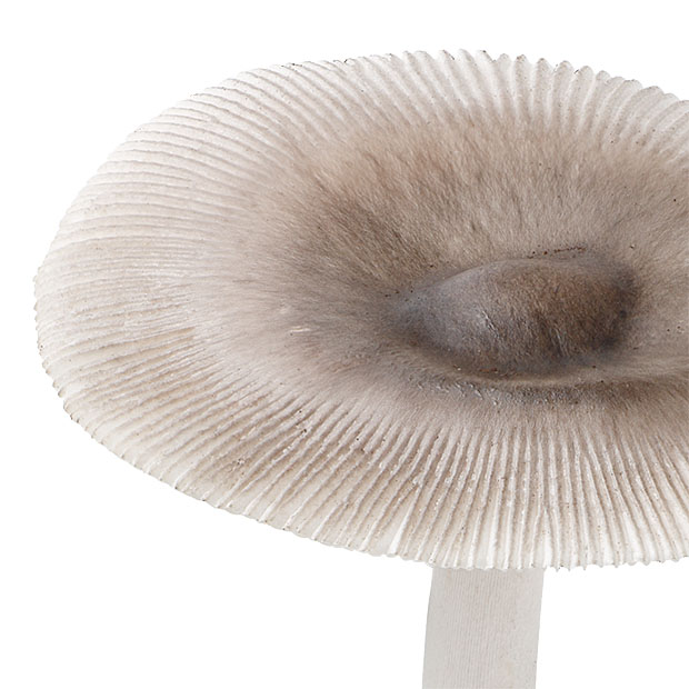 灰色のかさに筋(放射状の溝線)が目立ちます。