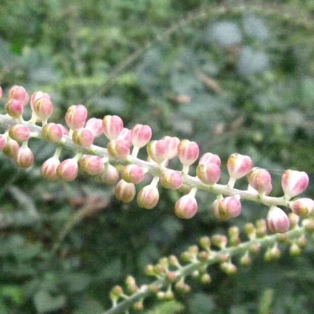 • 花には柄がある。 つぼみの時によくわかる。 丸いつぼみは淡紅色を帯び、 密につく。