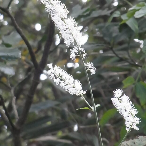 イヌショウマより遅れて咲きだし、 林の中で背の高い白いブラシのような花穂が目立ちます。 根は漢方薬の升麻(ショウマ)として利用され、 若葉もゆでて水にさらして食べたことが名の由来といいます。 (HT)
