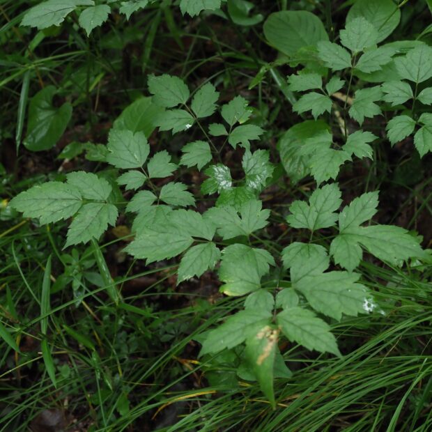 • 根生葉と下部の茎葉は大きく、 3回3出複葉。 小葉はしばしば3裂し、 鋭い鋸歯がある。