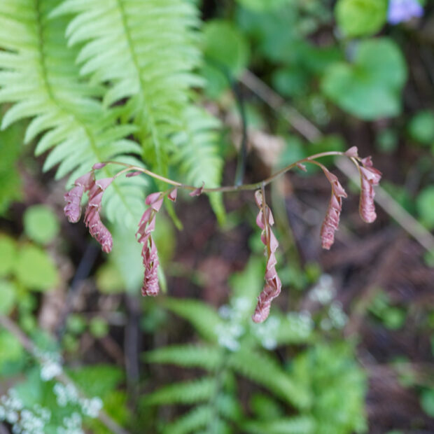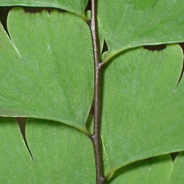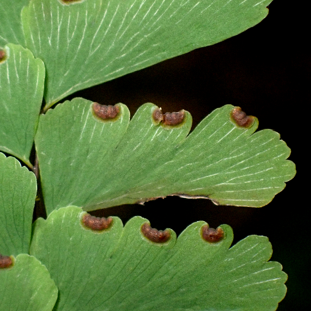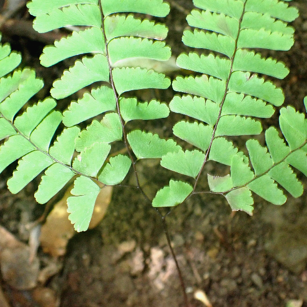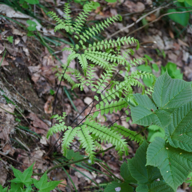 山地の林内に多いアジアンタム類のシダで、 北日本でよく見ます。 葉がクジャクの羽のように広がる姿は独特で、 見分けやすいです。 葉裏には、 フチに沿って胞子のう群をつけます。 園芸用にもよく育てられ、 若葉が赤くなるものがよく植えられます。