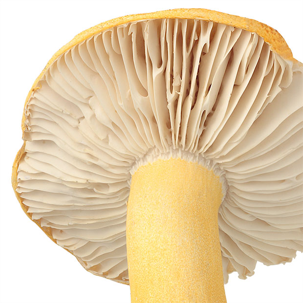 傘と柄のウコン色が美しく、 見つけるのがうれしいきのこです。 でも、 肉はちょっといやなにおいがします。