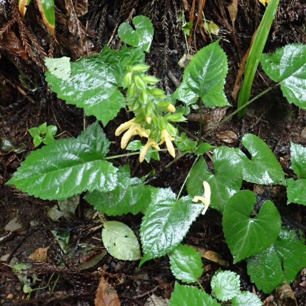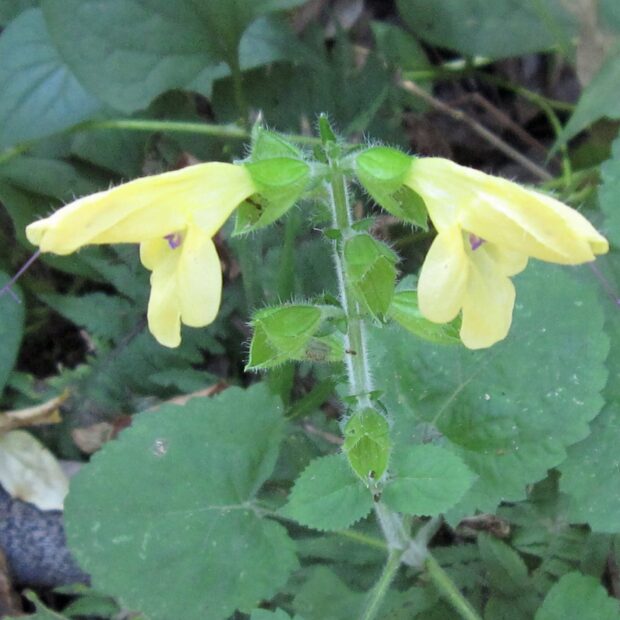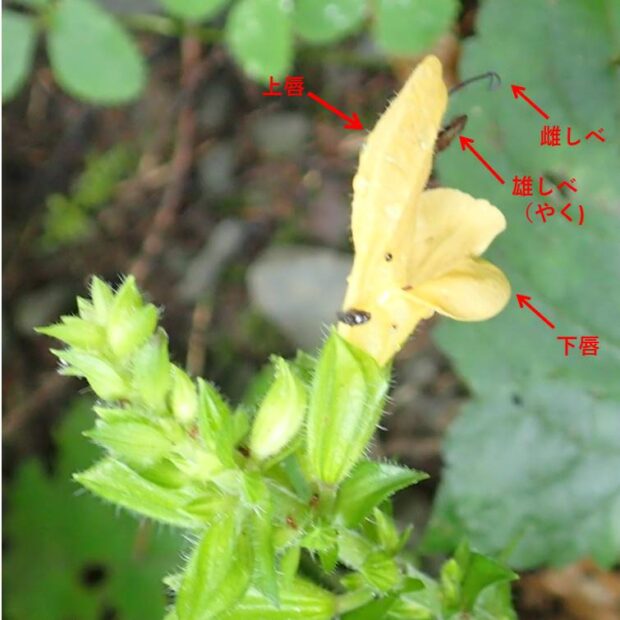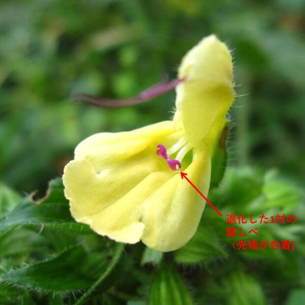 花壇によく植えられるブラジル原産の赤いサルビアとよく似た形の黄色い花を咲かせる秋の野草です。 名前の由来は、 秋に咲く桐(キリ)の花によく似た花で黄色いので、 黄花秋桐(キバナアキギリ)です。 蜜を吸いに来るハナバチなどの昆虫に花粉を運んでもらうための見事な仕掛けが花にはあります。 (HT)