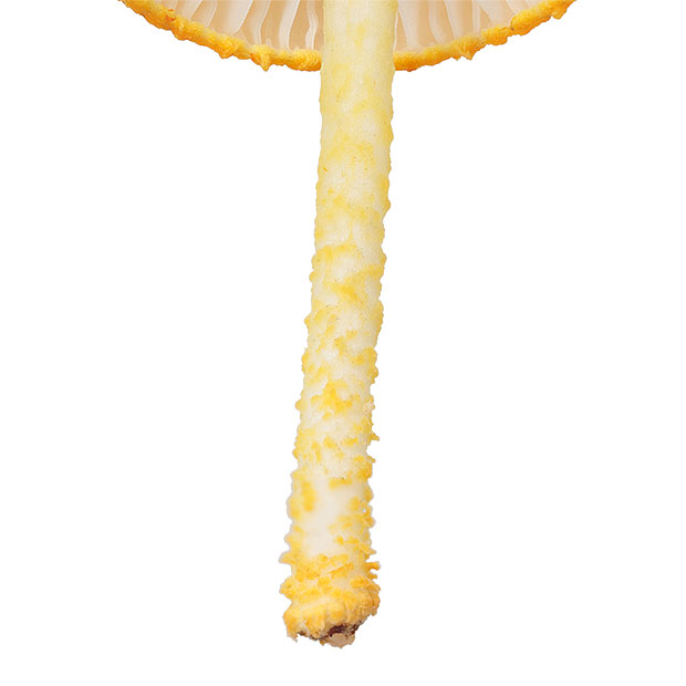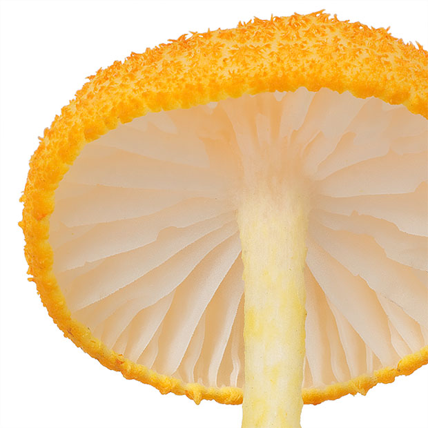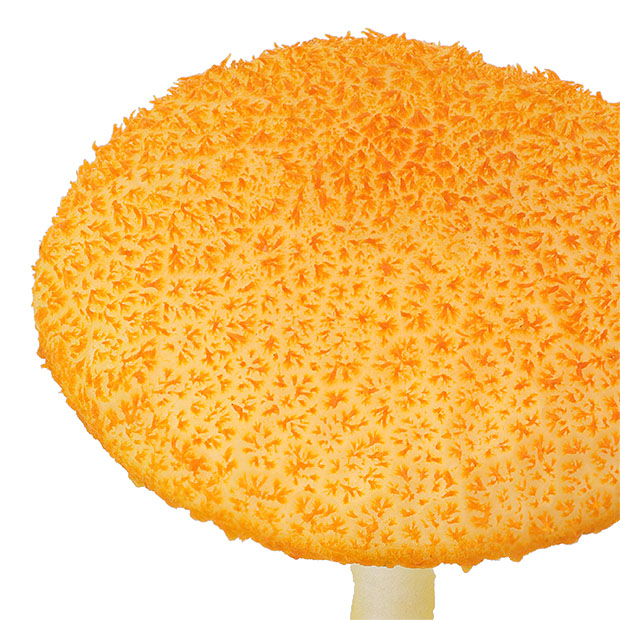 傘はオレンジ色の綿くずをとげとげにつける美しいきのこです。 日本では関東から西に分布し、 世界では熱帯を中心に広く分布します。