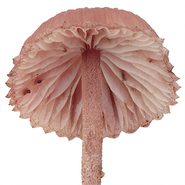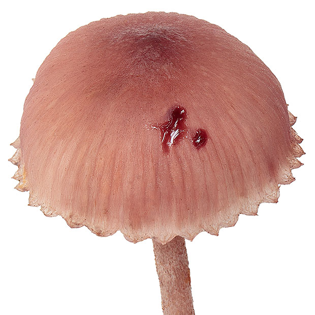つりがね型の傘のふちがふりふりしたかわいいきのこです。 傷をつけると、 血のような液が流れます。