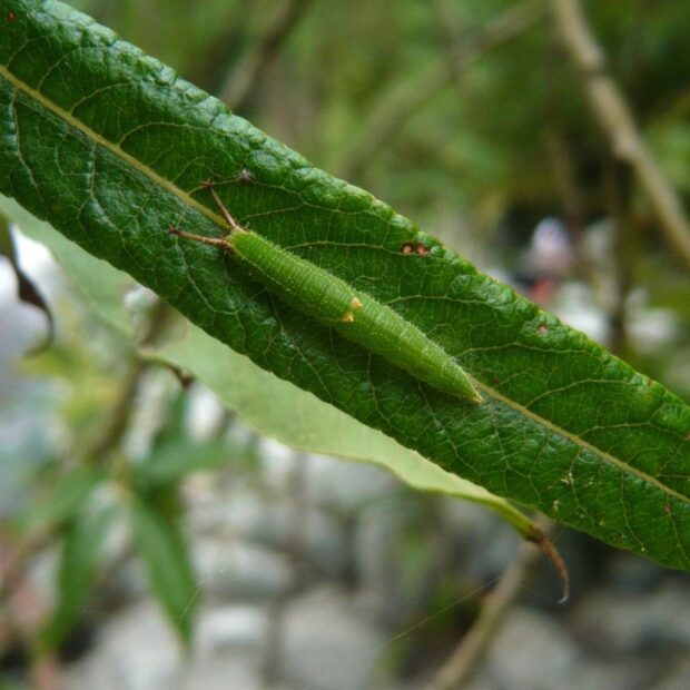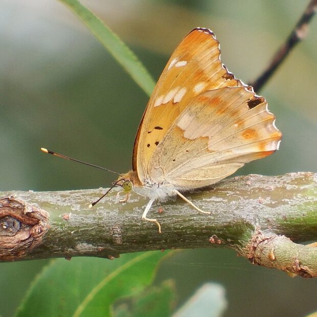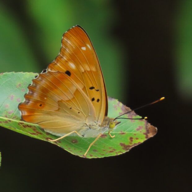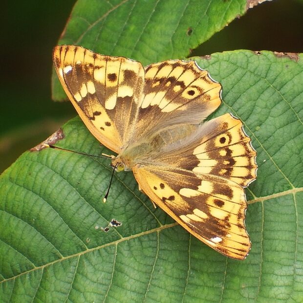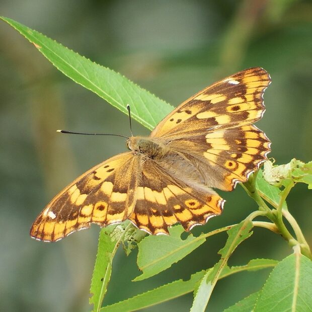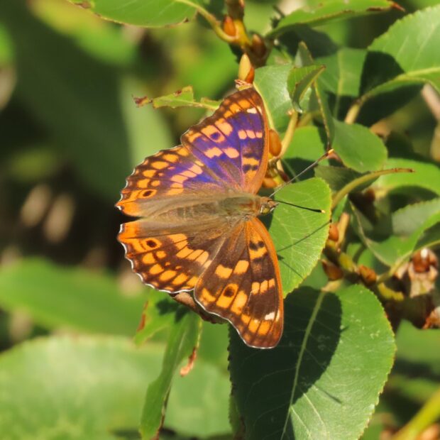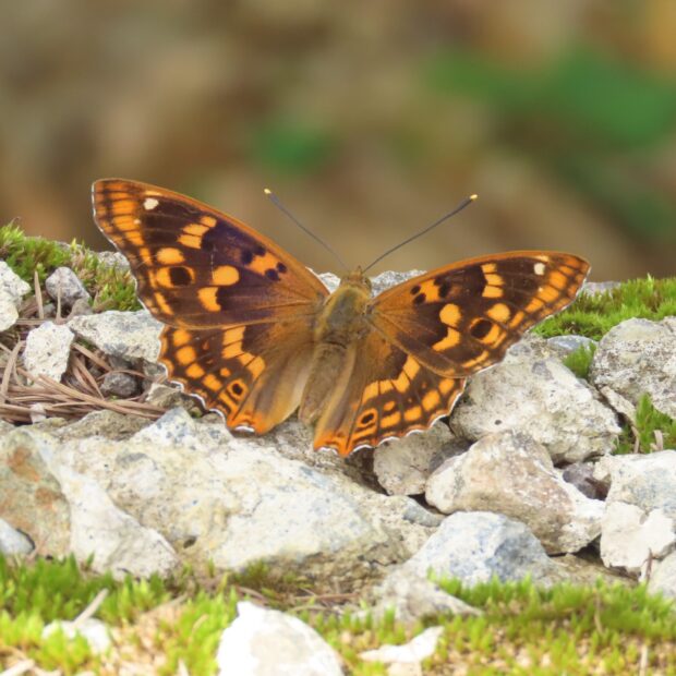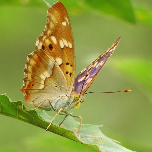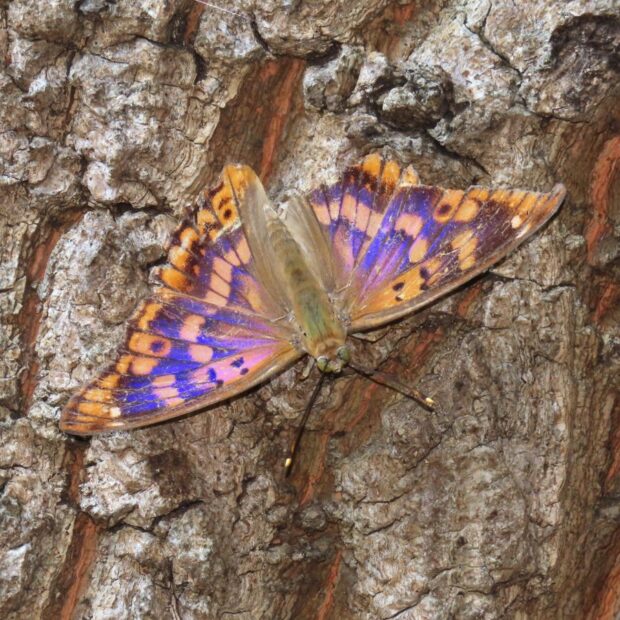 ヤナギ類が生える川岸の他、 都市公園でも見られるタテハチョウ。 オスの表ばねは光が当たると紫色に輝き、 メスは淡い茶褐色をしています。 日中、 ヤナギ類の樹上を活発に飛びかい、 地面でよく給水します。 晩秋、 幼虫は褐色になり、 ヤナギの枝のまたや幹の割れ目で越冬します。