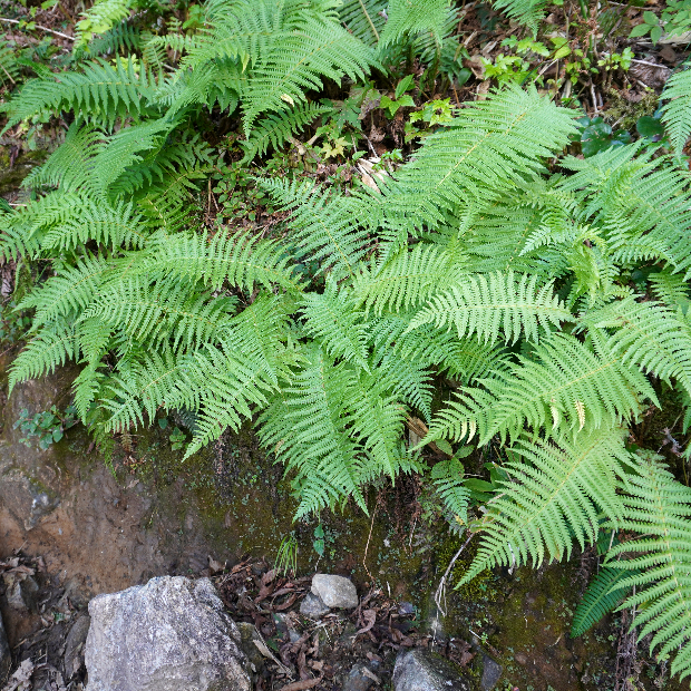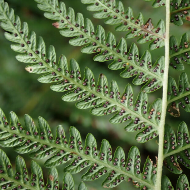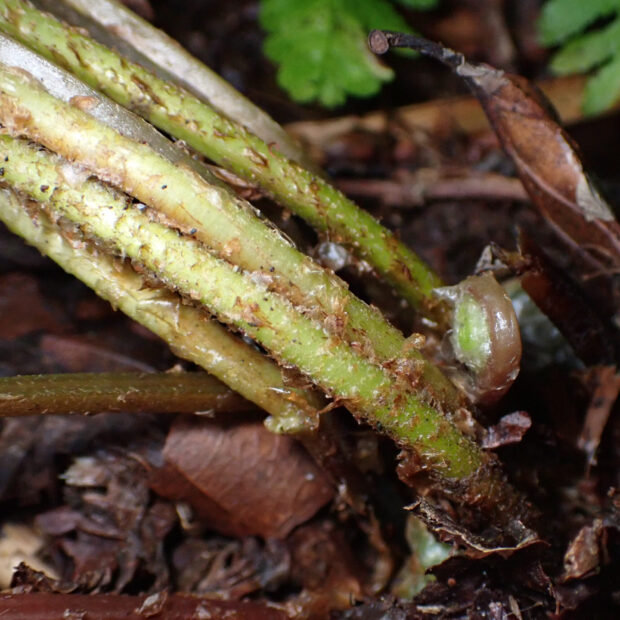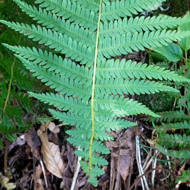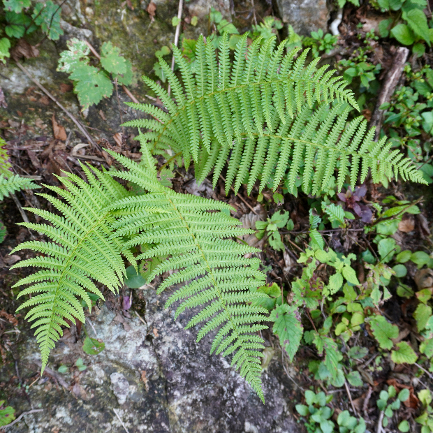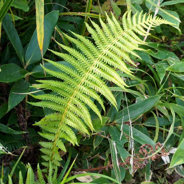 高山の草地や湿原によく見られるシダ。 ショリマはヒメシダの別名で、 それより大きくなることからこの名前があります。 下ほど縮まる葉形が特徴的です。