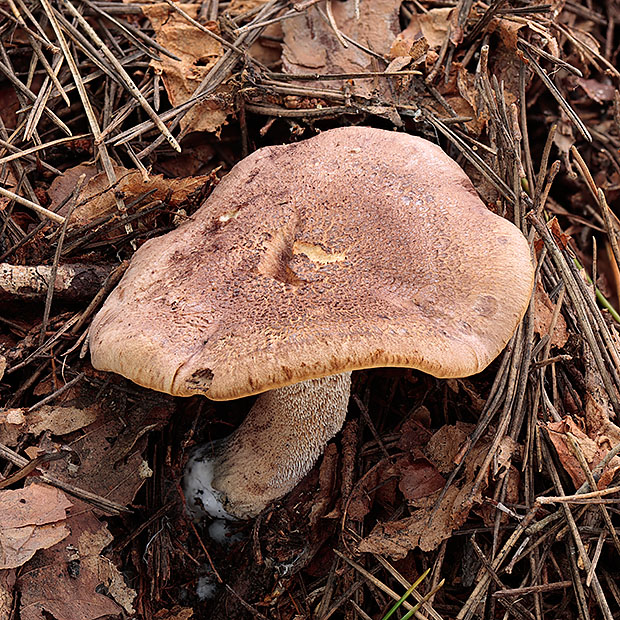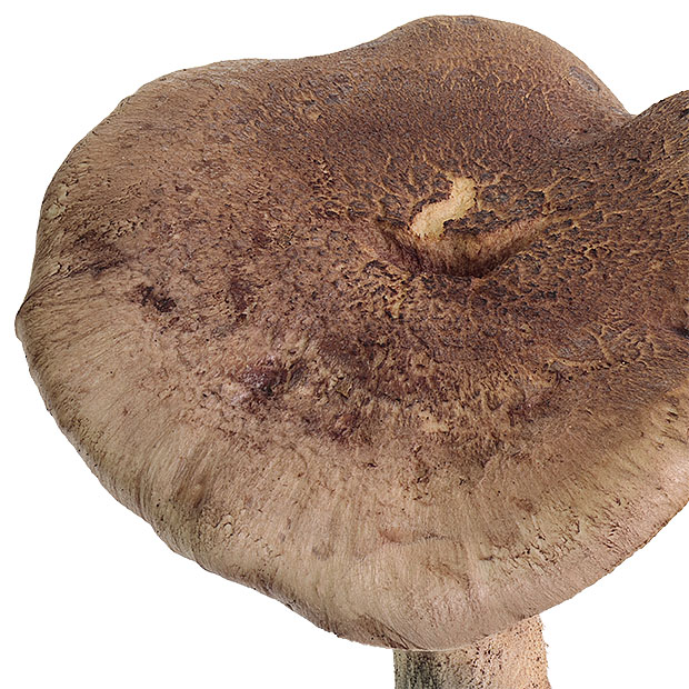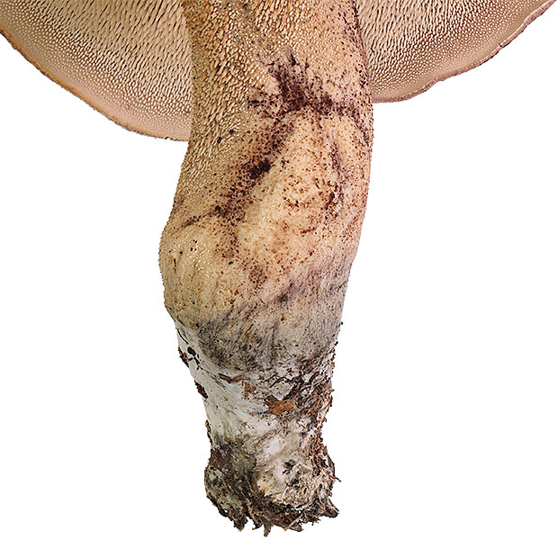 傘の裏が針状で、 食用きのこのコウタケと似ていてます。 ケロウジの傘の中央部はへこまず、 傘の表面の鱗片はほとんど立ち上がりません。 柄の根もとは青色をおびます。 味はとても苦いです。