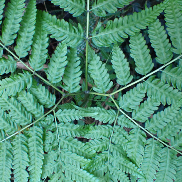 南日本に多い大きなシダです。 5枚に分かれる葉は変わっていて、 似た仲間は日本にいません。 名前は和歌山県の那智山からきています。