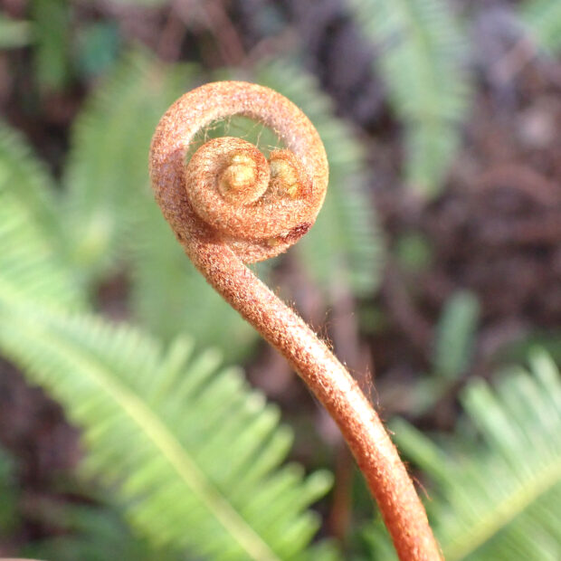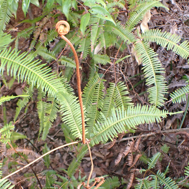 暖かい地域にごくふつうに見られるシダです。 正月飾りにも使われるウラジロのの別名がオオシダで、 それより小さいことからコシダといいます。 とはいえ、 本土でみられるシダの中では大きめで、 斜面に一面に生えることもあります。