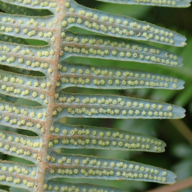 ●ウラジロは①コシダより大きくなり、 ②小羽片は深く切れ込み、 ③1本の軸からのみ羽片を出し、 ④胞子のう群は1つにつき胞子のう1~4個と少ないことなどが特徴です。