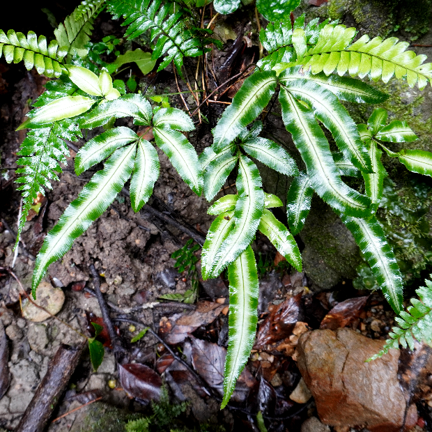 暖かいところに多いシダ。 葉は革のように厚く、 中央によくきれいな白斑がつきます。 「マツザカシダ」ともいいますが、 三重県の松坂(まつさか)市が由来なので、 「マツサカシダ」が本当の意味では正しいです。