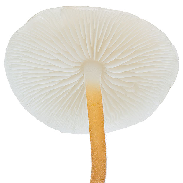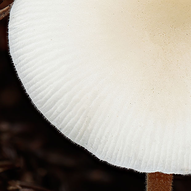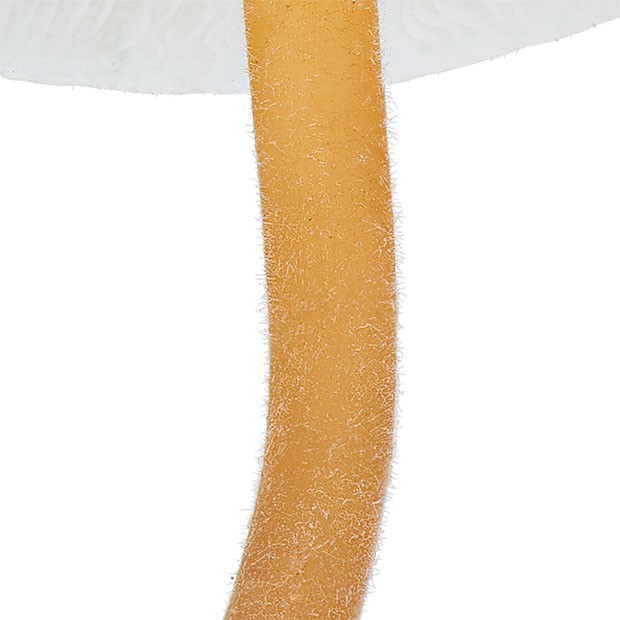秋が深まってくるとスギの近くでよく生えます。 スギの落ち葉のあいだで、 白い傘はよく目立ちます。 柄の根もとは落ち葉に埋もれたスギの落ち枝につながってます。