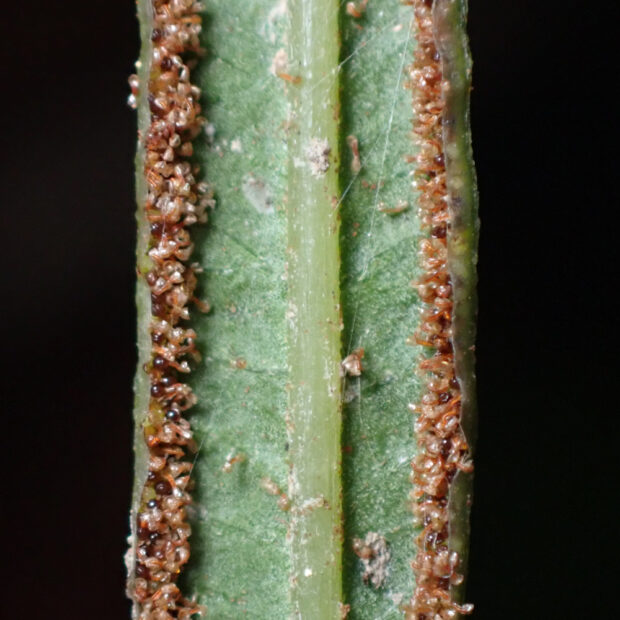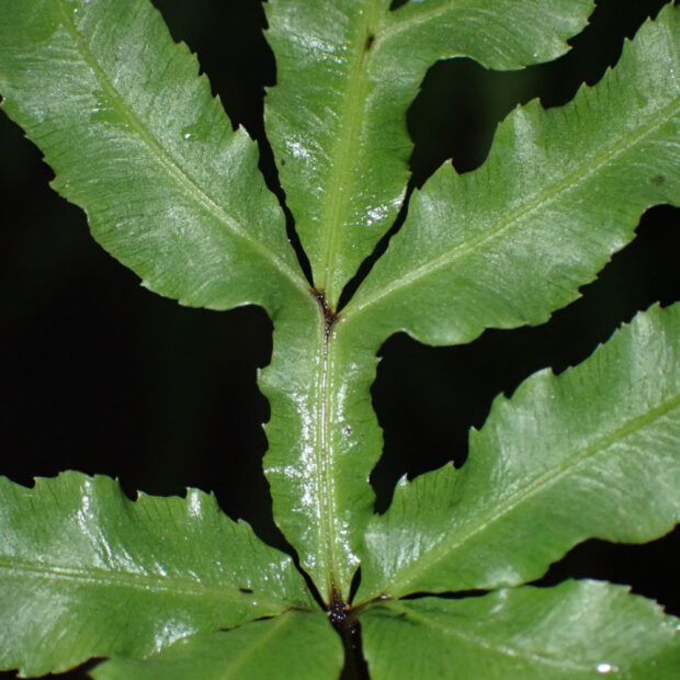 ●オオバノイノモトソウは①大きくなり、 ②葉軸に翼がなく、 ③脈はフチに達します。