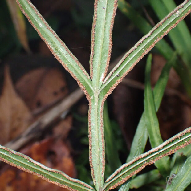 ●リュウキュウイノモトソウは①九州南部以南に生え、 ②さらに小型で、 ③葉軸に翼はありません。