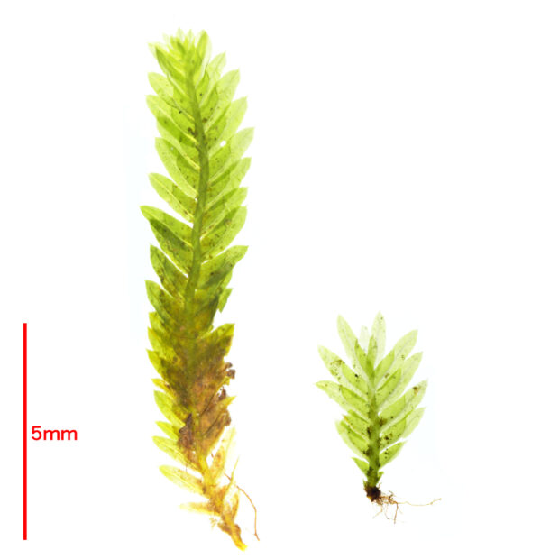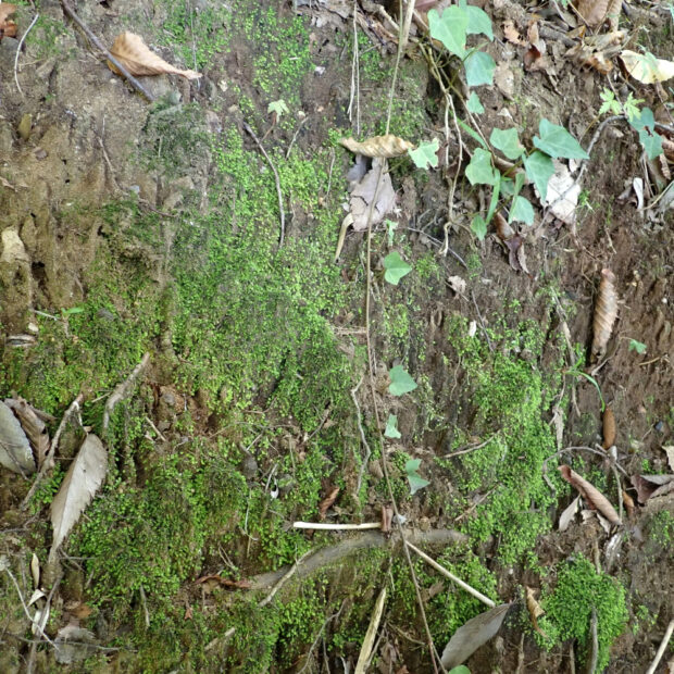 林内の土上によくマット状に生えている小さなホウオウゴケの仲間。 その形が針葉樹のキャラボクの枝葉に例えられました。