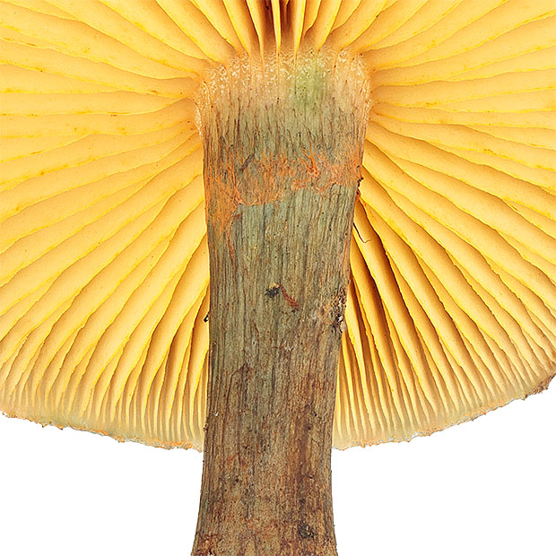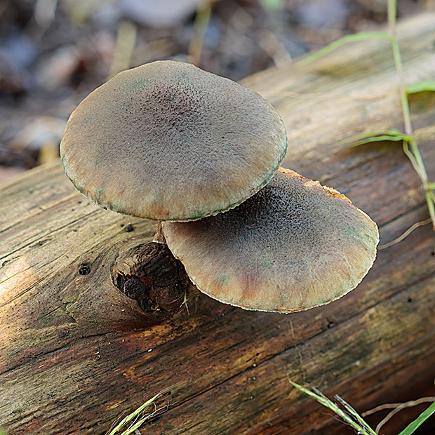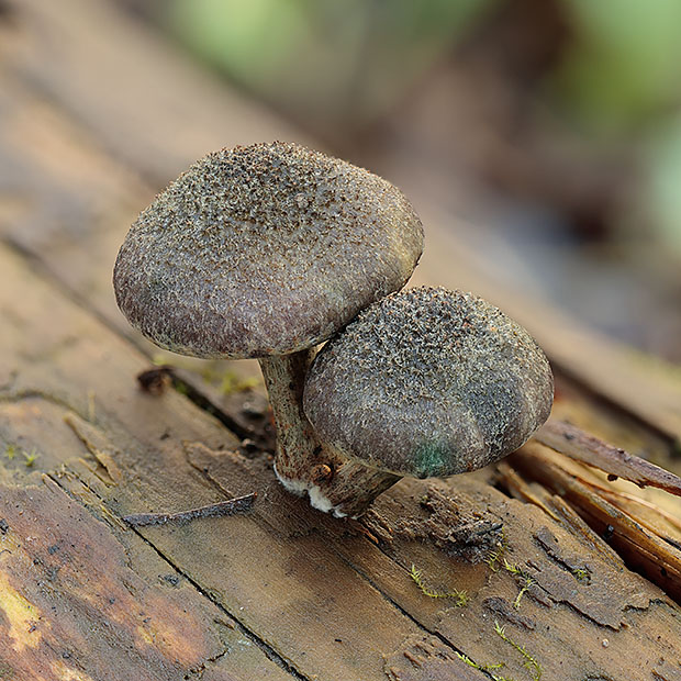 スギの枯れ木によく生えるきのこです。 ところどころに緑色をおびたしみのようになるのが特徴です。 柄の上部に消えやすいつばがあり、 胞子で褐色に染まります。
